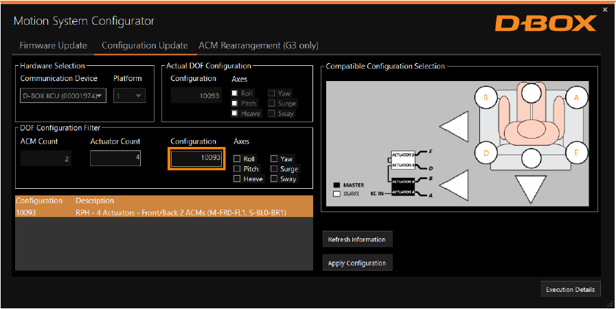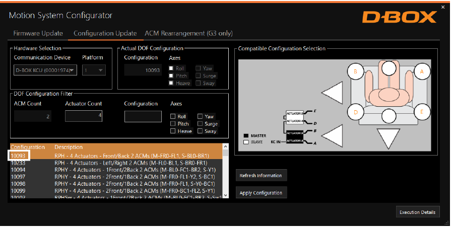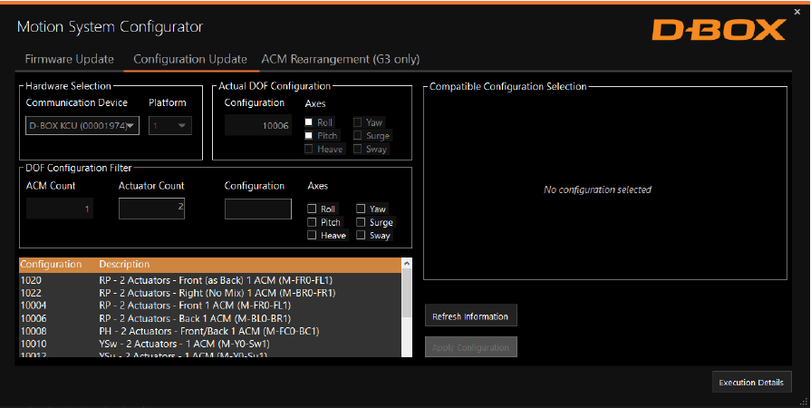 Select the platform number (if multiple platforms are connected to the KCU-1P). If there is only one platform connected to the KCU-1P, no selection is needed. The ''Actual DOF Configuration'' box shows the configuration which is connected. There is no selection to be done in this box. |